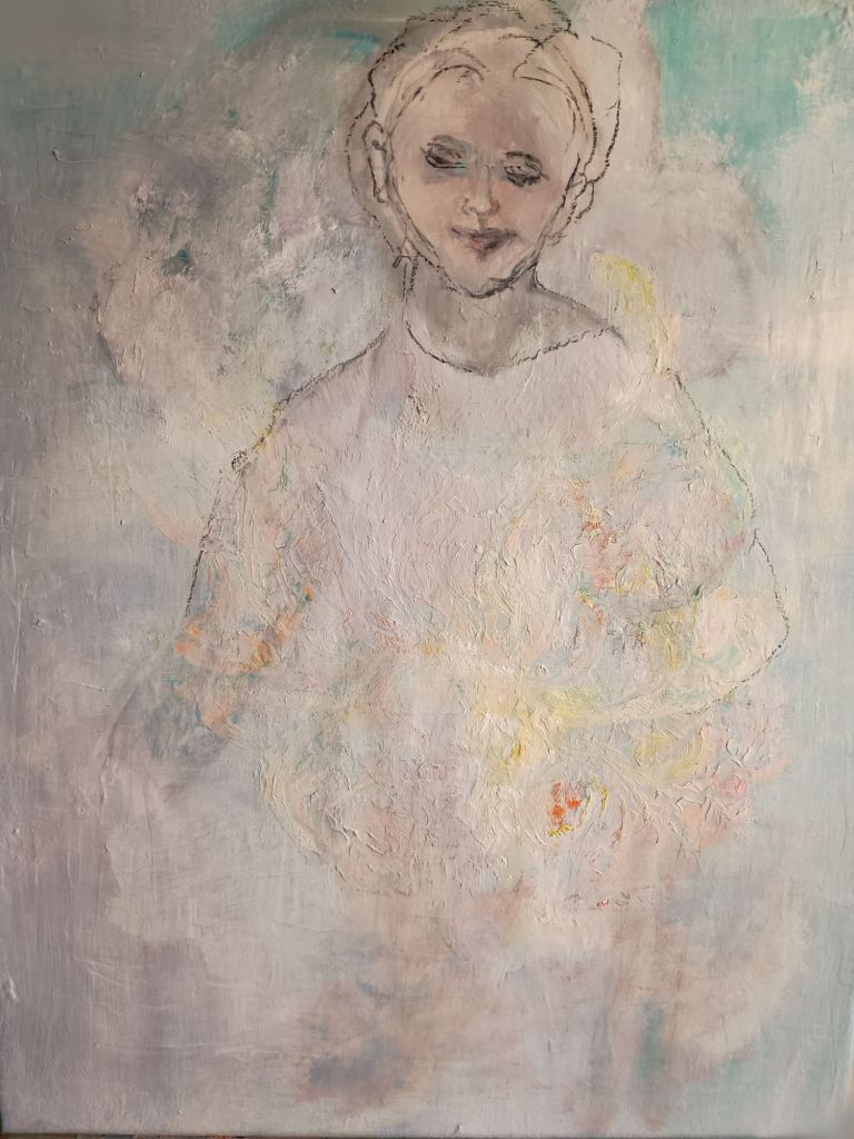 Engel A: Der Park ganz in der Nähe döst mittags im August. Schwere Dolden hängen über dem Boden; die Schafskopfhortensie trägt melancholisches Weiß. Trauerweidenzweige streichen über himmelfarbnen Wasserspiegel, Schilf und gelbe sibirische Lilien umrahmen den Teich. Wildes Geranium und zitronenfarben grelle Blüten der Rauke, hellblauer Phlox, gebeugtes Gras und ein Blick hinauf in die alte Eiche. Dann kommen Gartenmauern, über die sich wilde Rosen gießen, ein Schmuck, an dem die Augen hängen und silberne Spinnenfäden, zwischen Farne gespannt. Suchen wir Steine, stören die Unke, pflücken nachts Sterne, denken an die Welt? An die Welt denke ich nicht gerne. Mich stören die gleichgültigen Menschen.